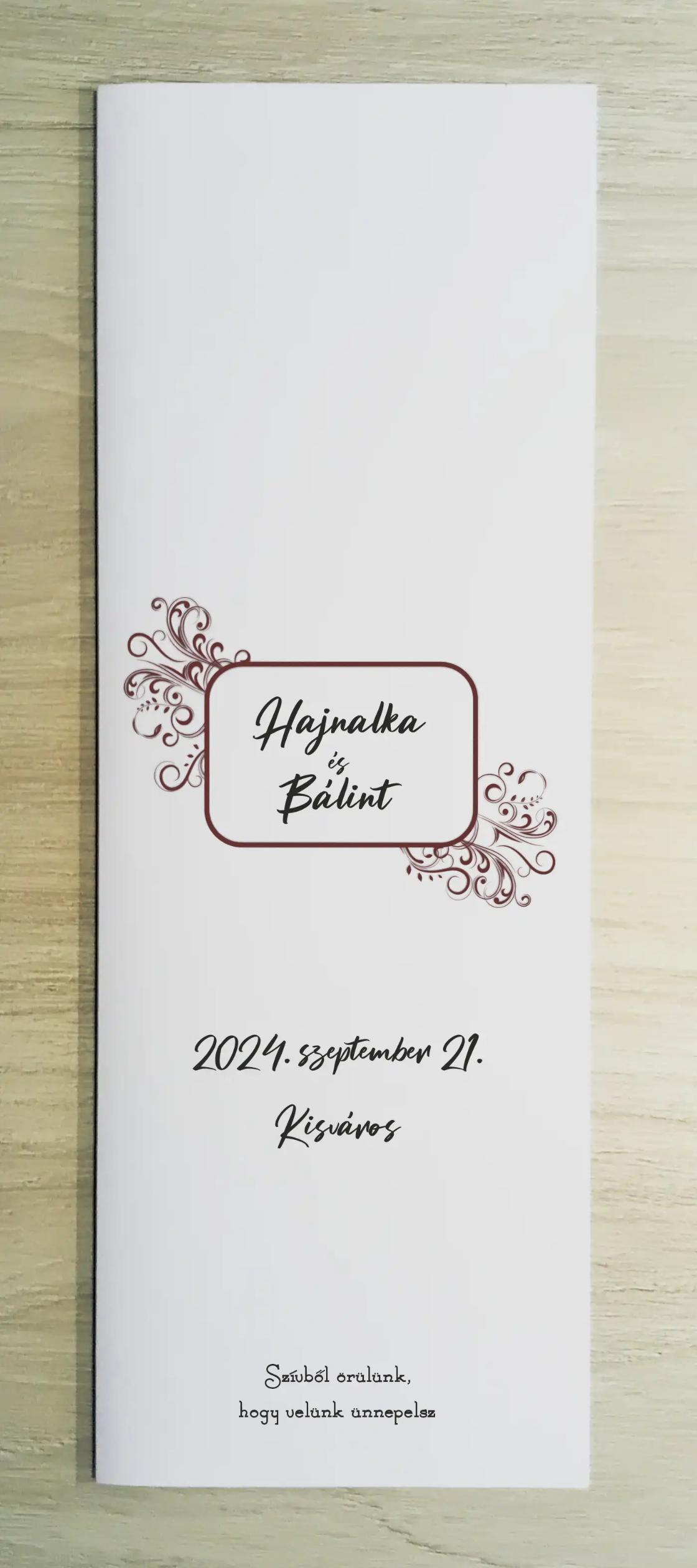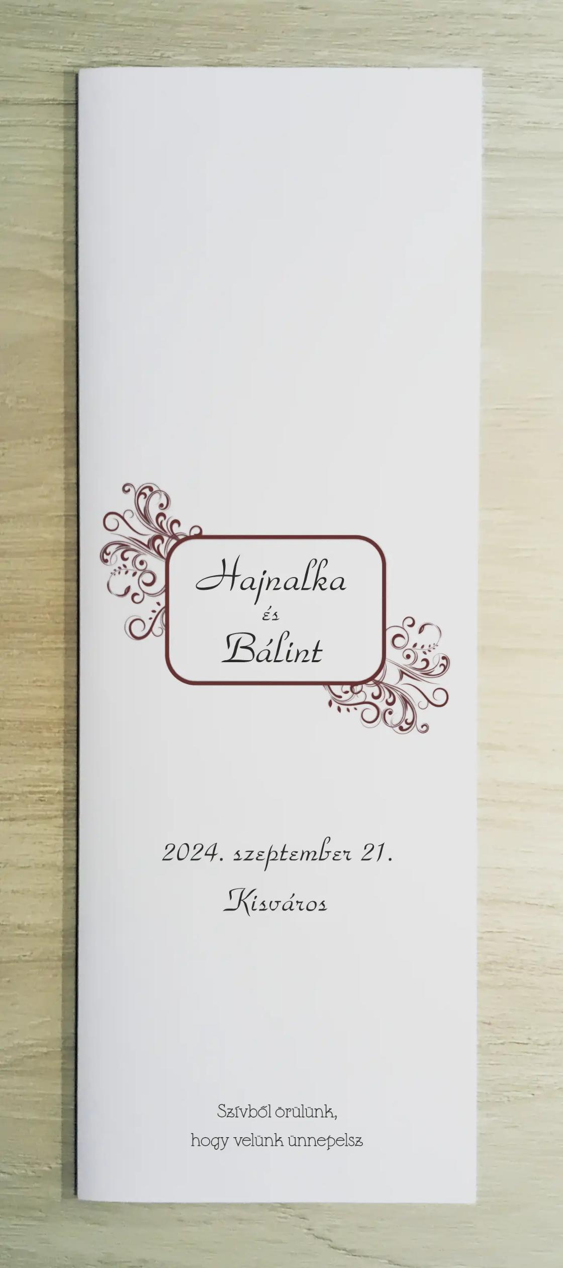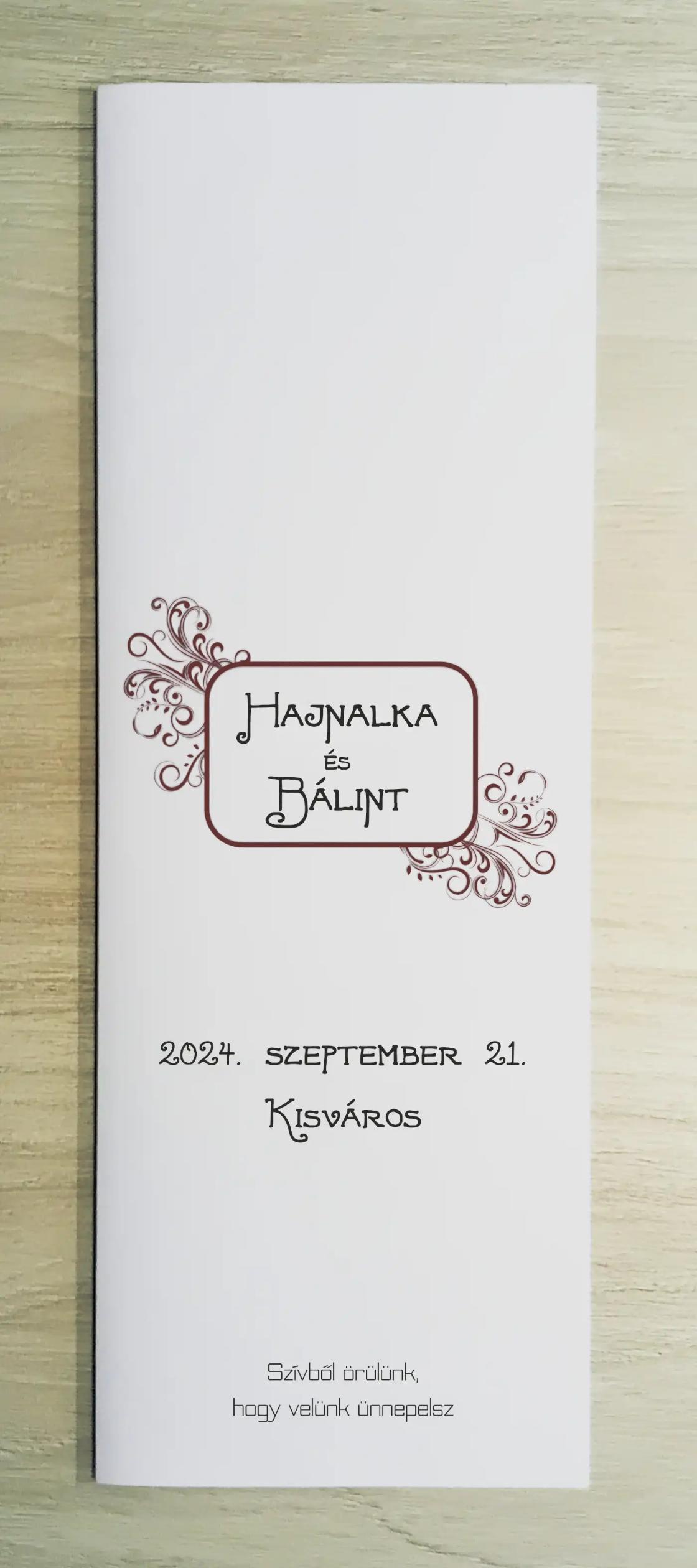 Az MEE06 meghívóhoz passzoló lakodalmi menükártya. Álló formátumú, oldalra nyíló.
