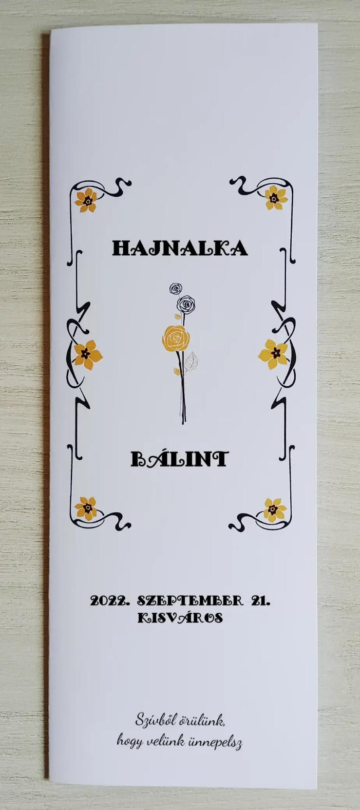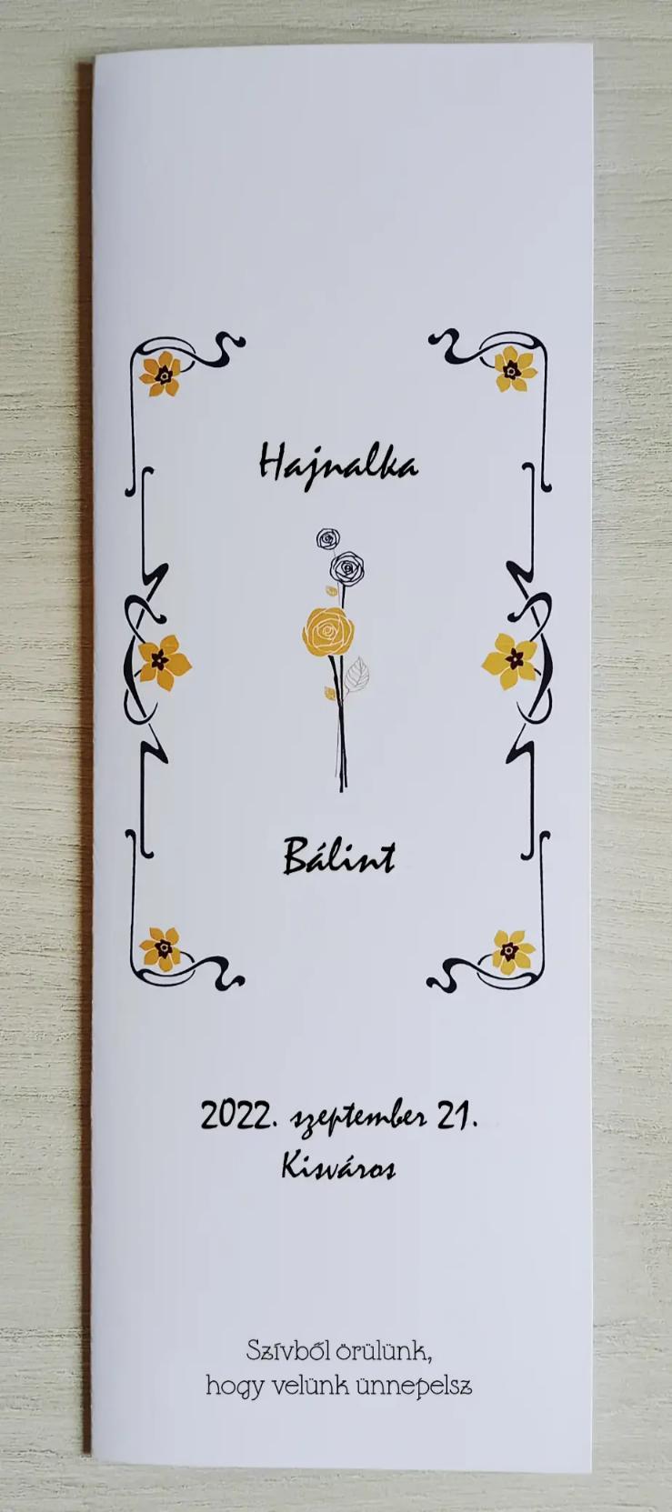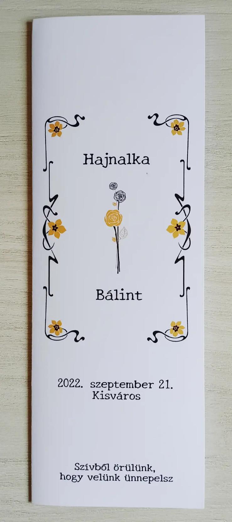 Az MEF10 meghívóhoz passzoló lakodalmi menükártya. Álló formátumú, oldalra nyíló.
