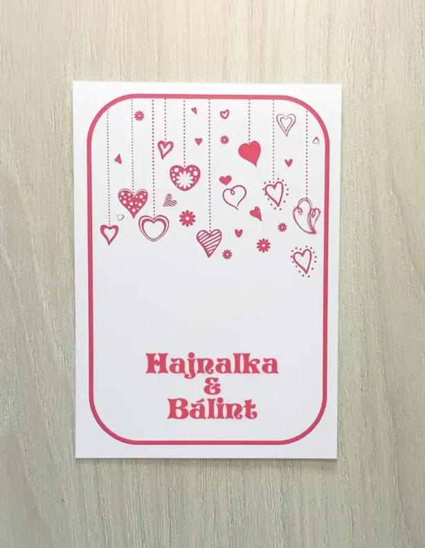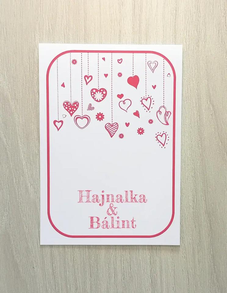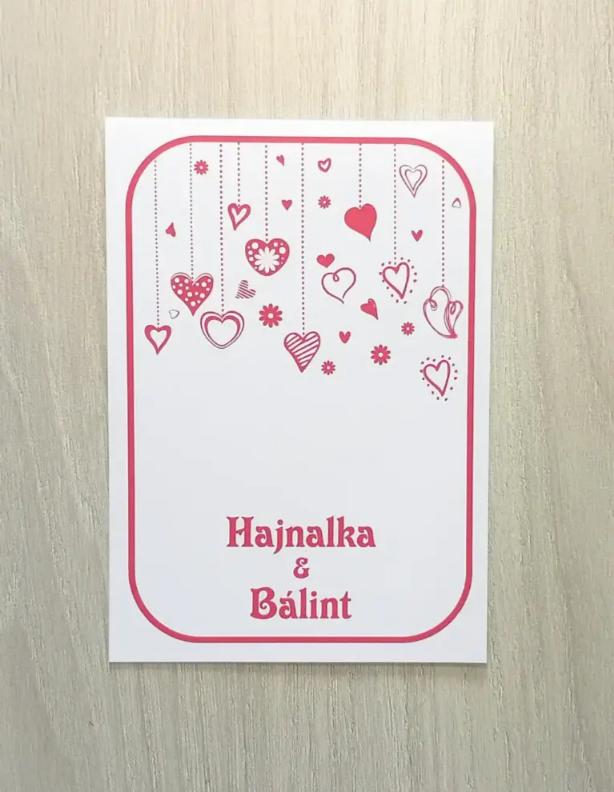 Fiatalos, mókás hangulatú szívecskés meghívó. Felfelé nyitható.