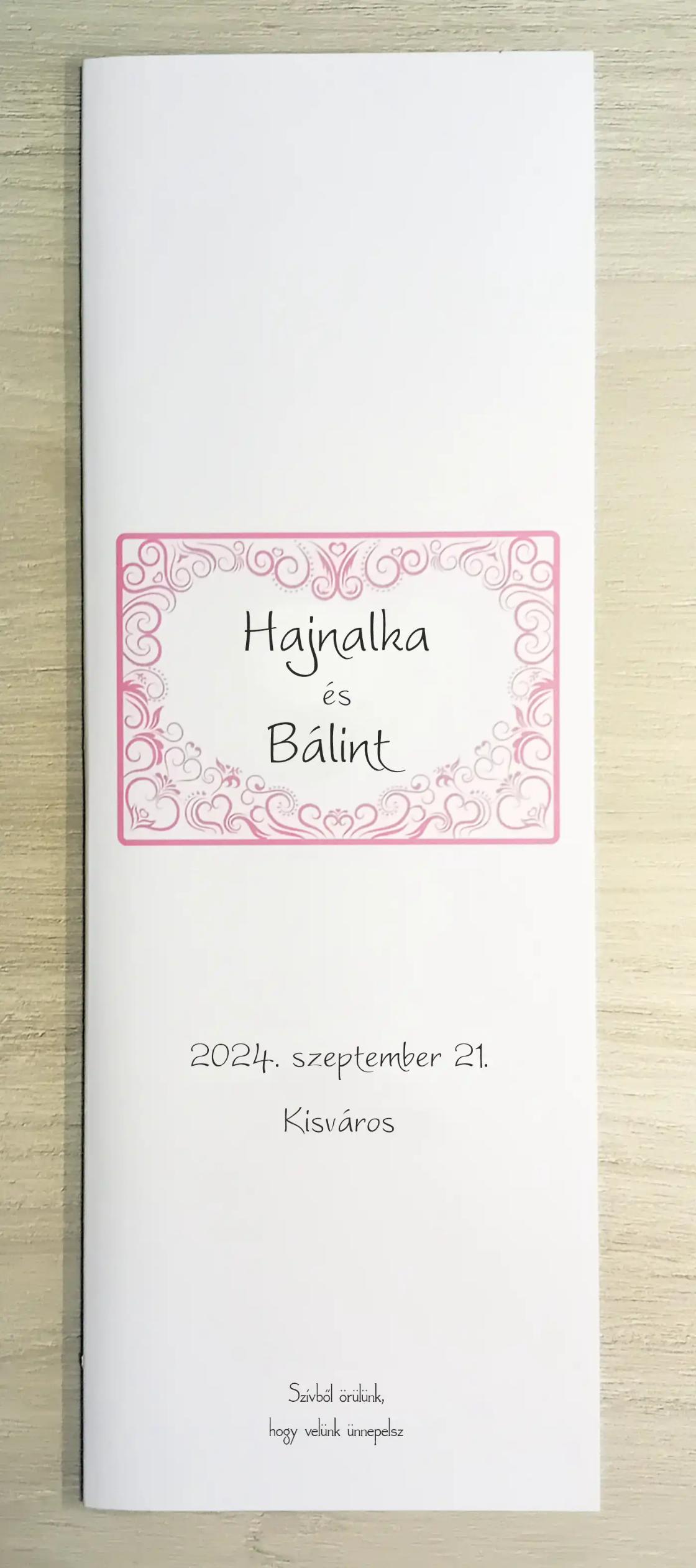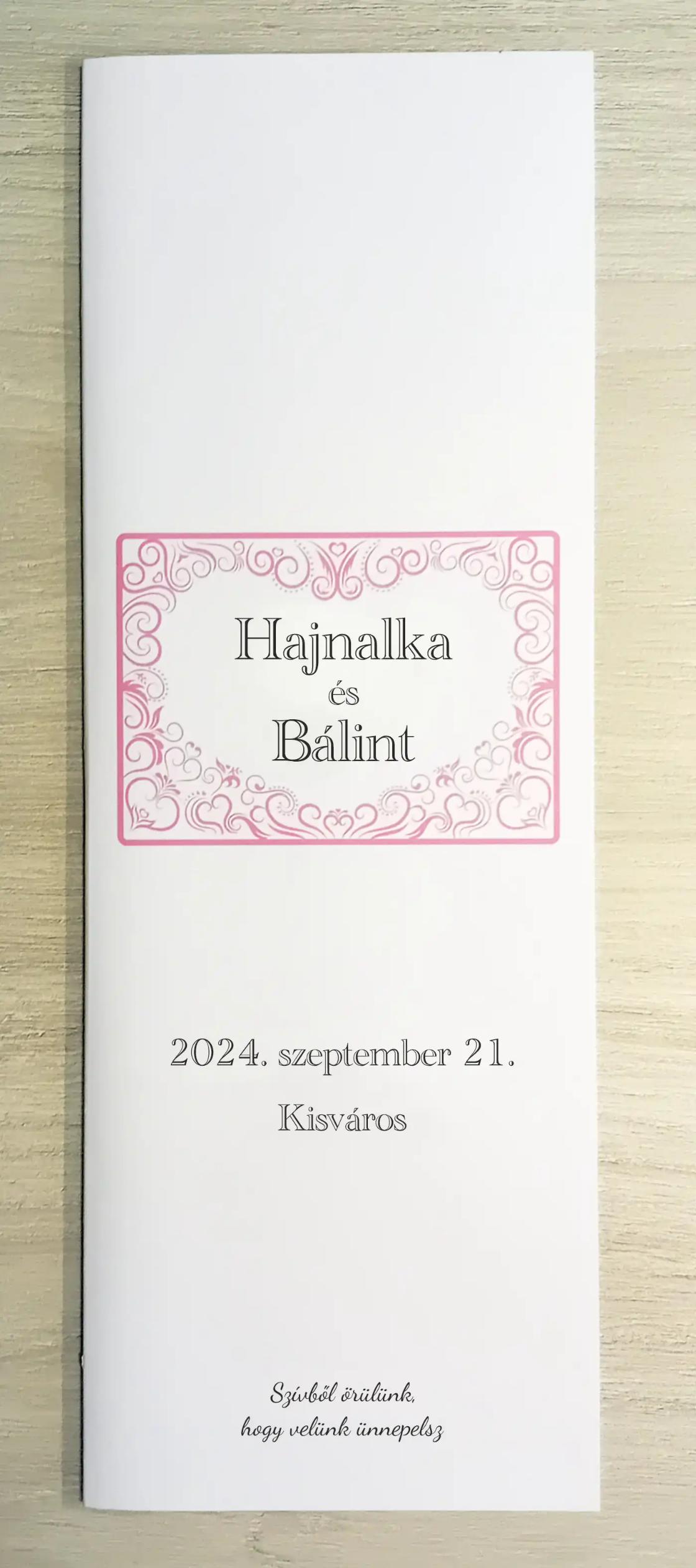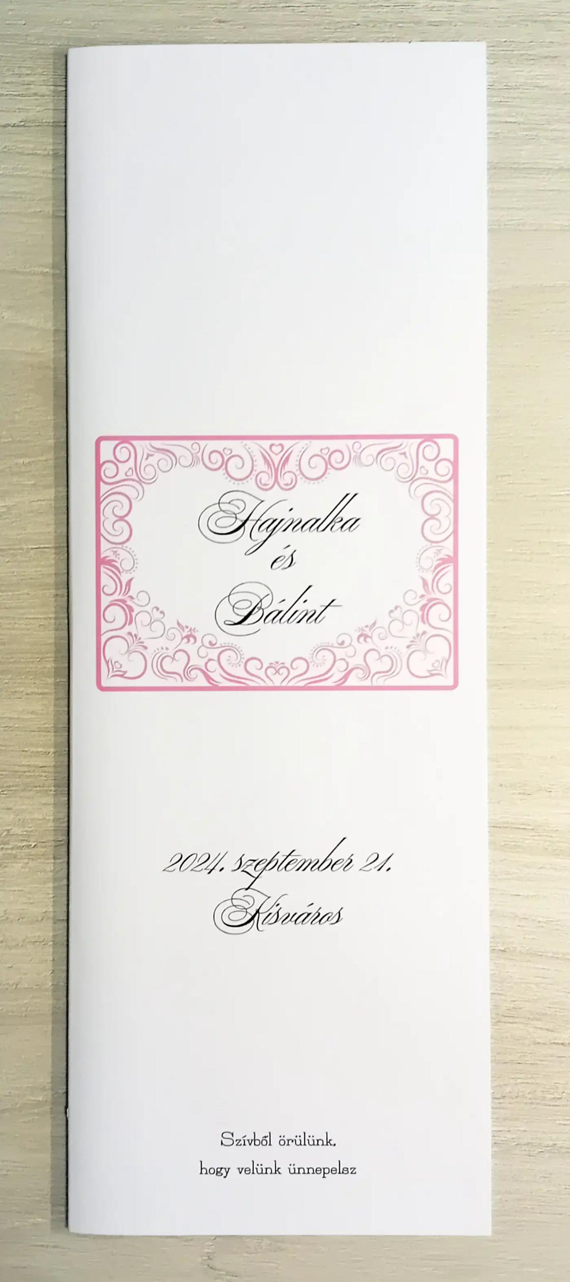 Az MEE05 meghívóhoz passzoló lakodalmi menükártya. Álló formátumú, oldalra nyíló.