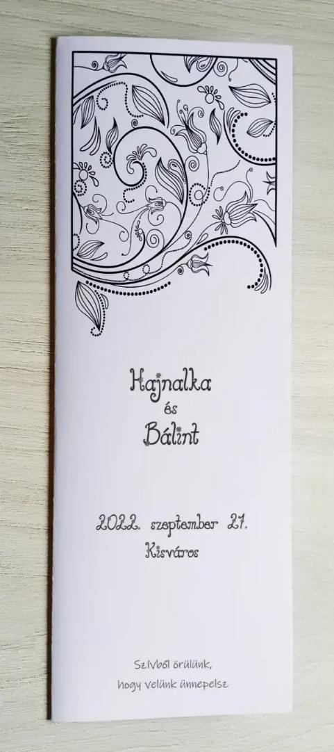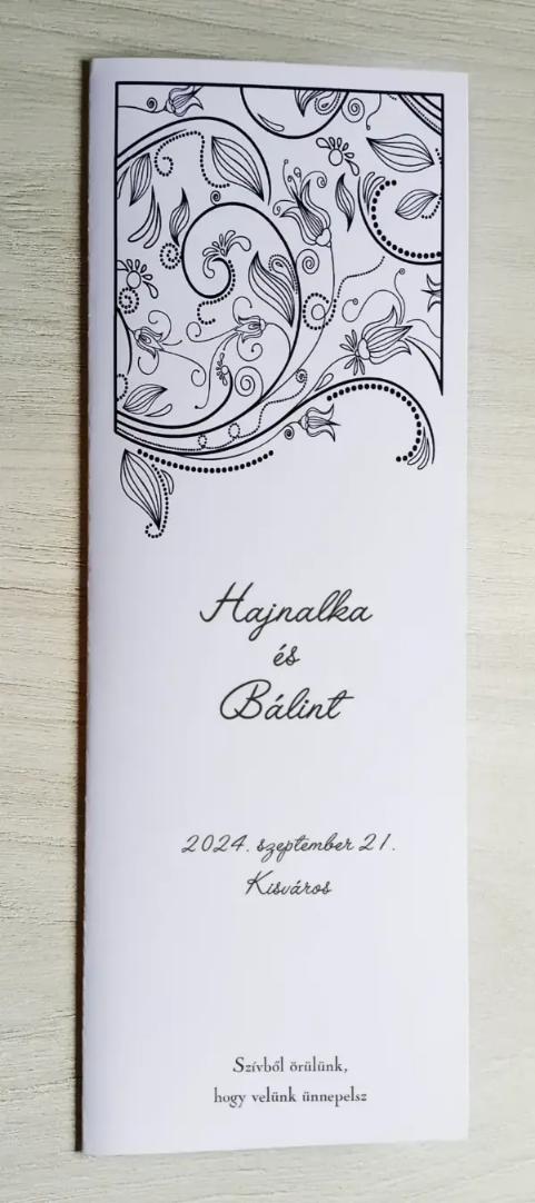 Az MEF07 meghívóhoz passzoló lakodalmi menükártya. Álló formátumú, oldalra nyíló.