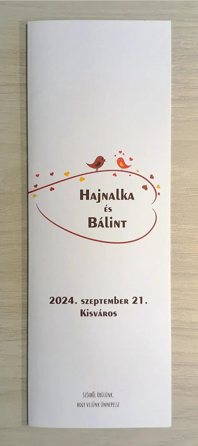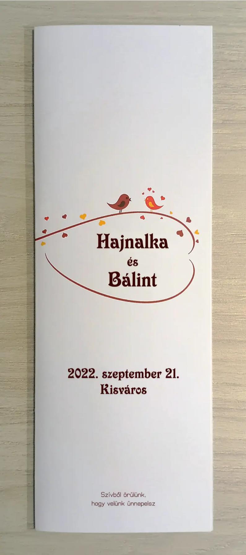 Az MEE01 meghívóhoz passzoló lakodalmi menükártya. Álló formátumú, oldalra nyíló.